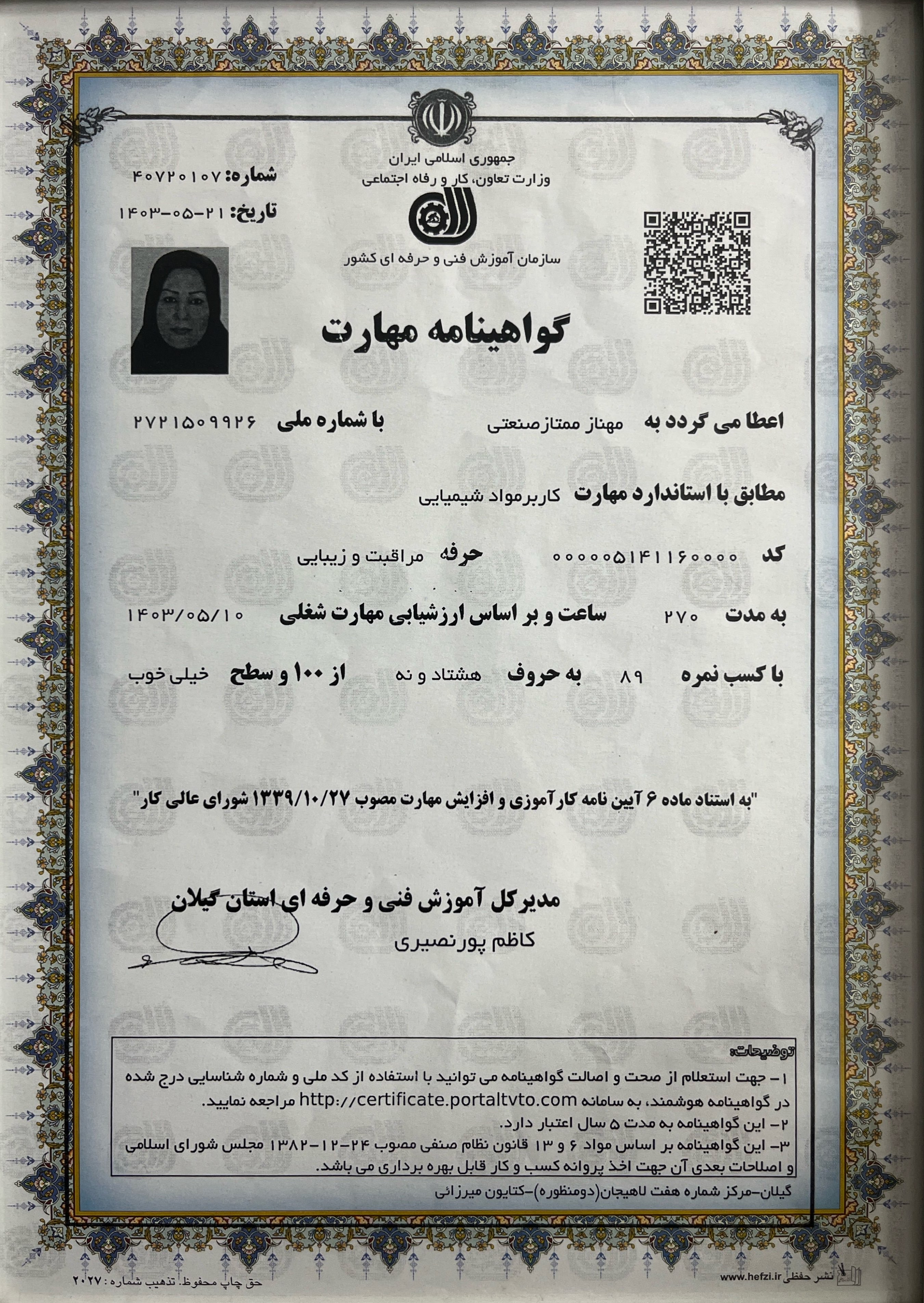 گواهی کار با مواد رنگ و دکلره